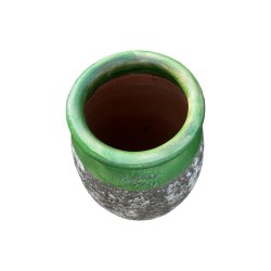 Jarre Biot olive petit modèle en terre cuite avec un col vert et une finition ancienne, fabriquée en France.
